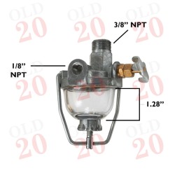Double inlet, shallow glass fuel bowl tap assembly to suit various American and UK vintage tractors.